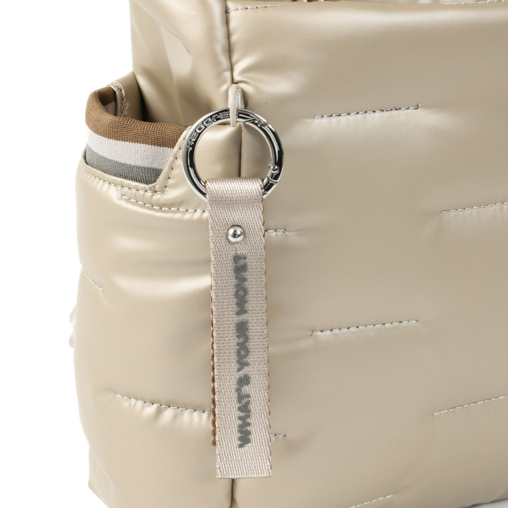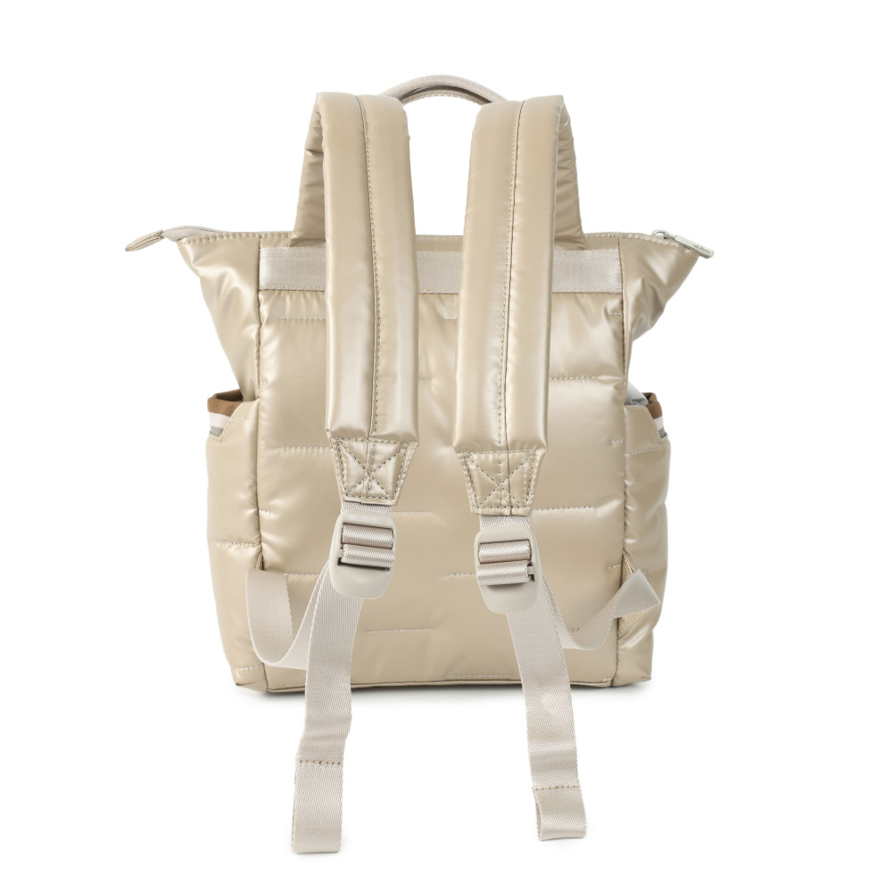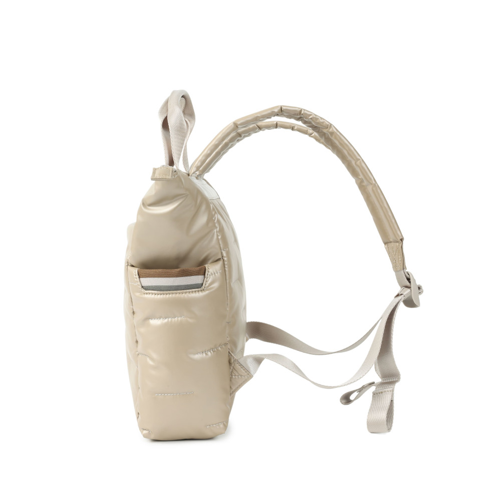 Вместительный, дутый рюкзак-идеальный спутник на каждый день. Оснащен большим основным отделением с внутренними карманами и съёмной косметичкой. С внешней стороны расположен карман на молнии, также есть боковые карманы для зонтика или бутылки с карабином для ключей. Выполнен из плотного 100% polyester.