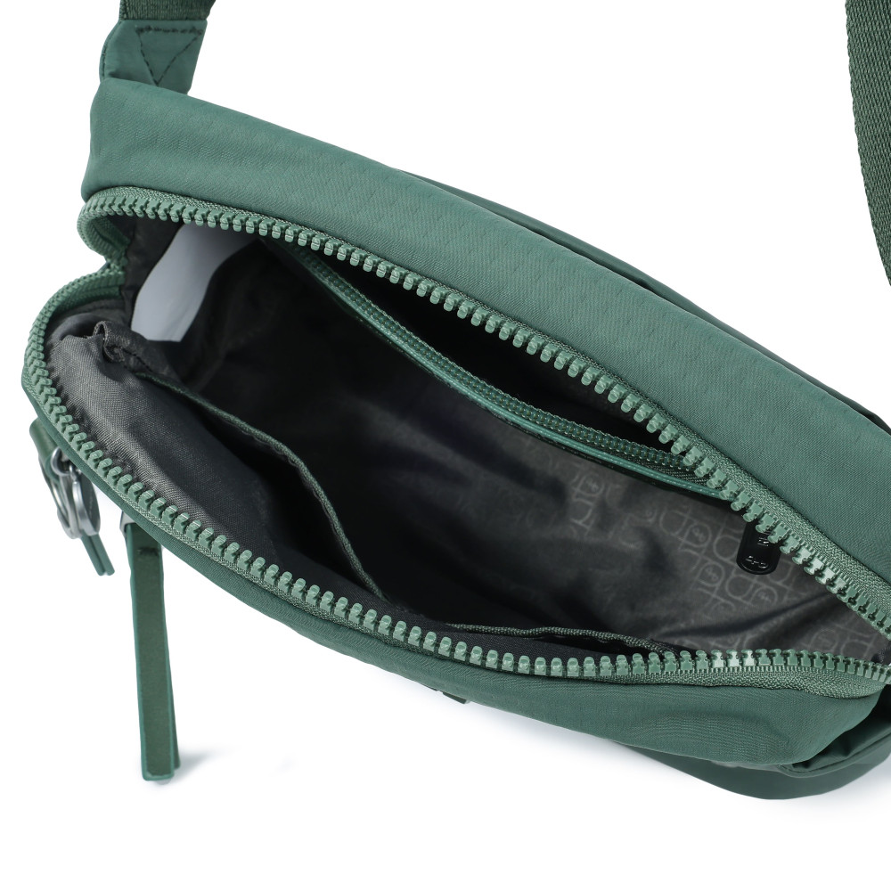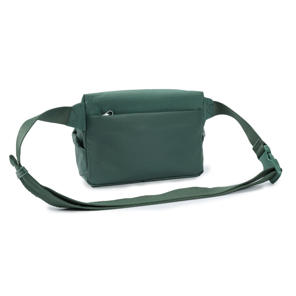 Зручна, компактна сумка на пояс виготовлена з переробленої тканини в поєднанні з еко-шкірою. Оснащена основним відділенням на блискавці з відділом для смартфону, та додатковою кишенею на блискавці з RFID-захистом. На задній кишені виробу, передбачено втоплену блискавку, яка щільно прилягає до тіла, як додатковий засіб безпеки. Має регульований по довжині ремінь та напівавтоматичну застібку.